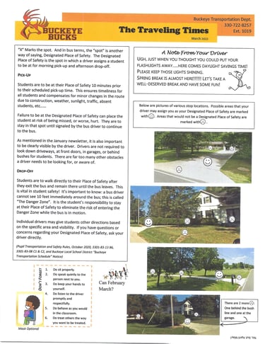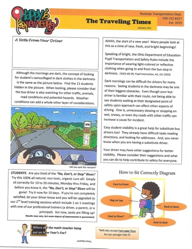 With a recommendation from the Junior High School Principal, Mrs. Conley, and approval from the Director of Operations, Jon List, and the Board, I published The Traveling Times for all bus drivers to distribute to their riders. They had a space to add their own message to personally customize each issue.